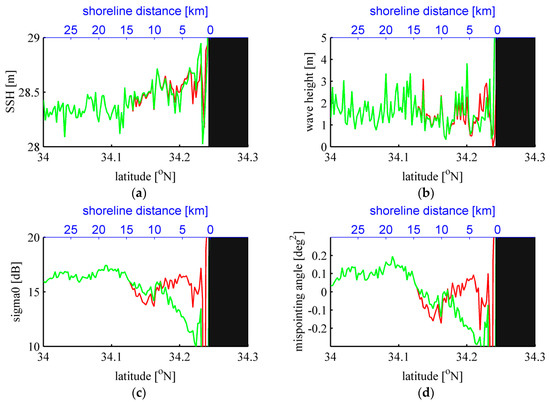 SSH (a); SWH (b); sigma0 (c) and mispointing angle (d) before (green) and after (red) land compensation south of the Tsushima Islands for cycle 22 of the Jason-2 altimeter.