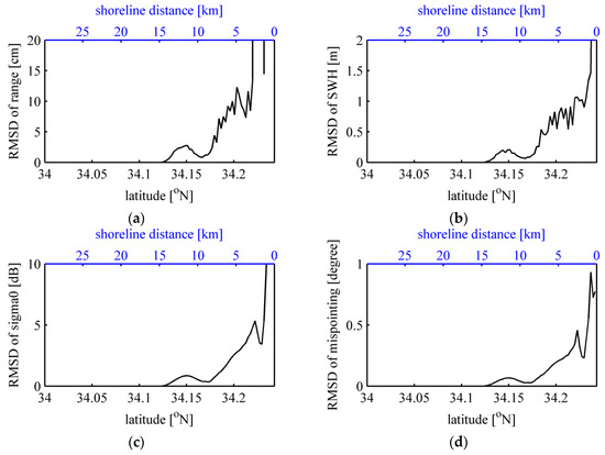 RMSD between the results with and without land compensation south of the Tsushima Islands for seven years of Jason-2 altimeter data; for range (a); SWH (b); sigma0 (c) and mispointing angle (d).
