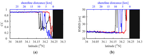 Two statistics, the correlation coefficient (CC) and the RMSD between the time series of SSHA derived from altimeter and tide gauge measurements, are used to validate the data quality as discussed in [16]. Figure 10a shows the CC variation along the track over the Tsushima Islands for the three different methods. Figure 10b is the RMSD in centimeters. These results show that the conventional ocean retracker in the SGDR product cannot provide a correct estimation within 10 km from the coastline, which corresponds approximately to the radius of the Jason-2 altimeter footprint. Meanwhile, since the ALES retracker only uses the sub-waveform around the leading edge, the noise that first appears in the waveform trailing edge has no influence on the range estimation. As a result, the ALES range estimation can be extended to about 7 km from the coastline.