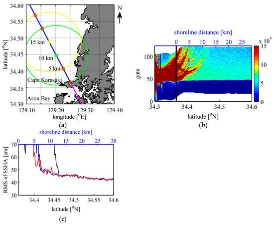 However, the approach distance strongly depends on the area geography. Figure 12 shows the results around the northwest coast of the Tsushima Islands. As can be seen in Figure 12a, the northwest coastline is very complex due to the numerous small bays. In addition, a small cape (Karasaki) around 34.36°N separates Asou Bay from the open ocean. As shown in Figure 12b echogram example, the section of pass 36 in Asou Bay (purple line in Figure 12a) includes an excessive number of bright targets. Since the present method identifies and removes isolated bright targets in the trailing edge, it cannot be applied to that area of Asou Bay. For the north of Cape Karasaki (from 34.36 to 34.6°N), however, the method described in Section 3 is successfully applied. At each latitude, the root mean squared (RMS) variation for the SSHA is calculated with three different retrackers (Figure 12c). When approaching from the open ocean (34.6°N), the RMS gradually increases, but that of the SGDR SSHA suddenly increases about 13 km from the Cape Karasaki coastline. The other two products maintain a gradual growth rate until 7 km from the coastline, but the approach distances are larger than that in Section 4.