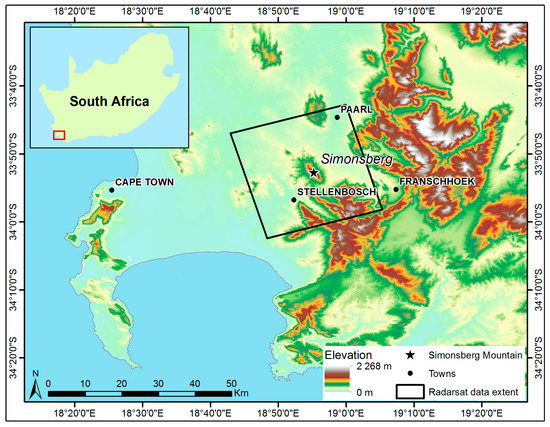 To test the ability of the NDαI to identify burnt areas and thereby contribute to operational fire monitoring systems, the algorithm was tested in an area located near Simonsberg Mountain, situated between the towns of Stellenbosch and Paarl in the Western Cape Province of South Africa (Figure 1). Simonsberg Mountain is 1399 m high at the peak with slopes averaging 20° although slopes of up to ~72° are present. Slopes face in a north-to-north-easterly direction as well as in a south-to-south-westerly direction. The mountain is situated in an area hosting Swartland Shale Renosterveld and Mountain Fynbos vegetation types, while the surrounding areas are characterised by vineyards, plantations and agricultural land. The climate in the area has been described as typically Mediterranean with warm dry summers and cool, wet winters [34]. Average daily maximum temperatures range between 27 °C and 34 °C in summer with almost no rainfall occurring during the summer months. The hot, dry conditions are ideal for the occurrence of wild fires, which are generally experienced between the months of November and March [11]. One such fire started on the lower slopes of Simonsberg Mountain on 19 January 2016. The fire engulfed most of the mountain, destroying farmland, vineyards and natural vegetation in the process.