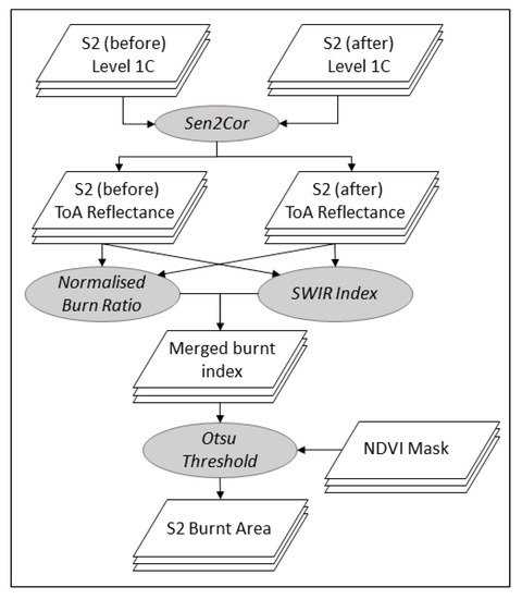 The Sentinel-2A processing workflow for burnt area mapping (S2 = Sentinel-2, ToA = Top of Atmosphere, SWIR = Shortwave Infrared, NDVI = Normalised Difference Vegetation Index).
