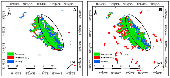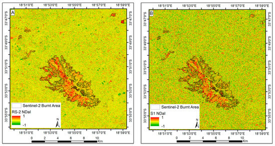 Comparing the results of the Sentinel-2A burn scar extraction with the NDαI-derived burn scar from RADARSAT-2 (A) and Sentinel-1A (B).