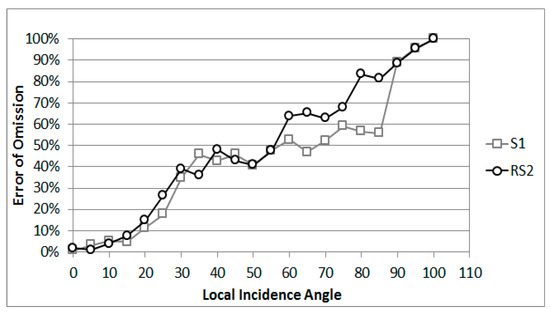 When the errors of omission are considered, it is observed that a strip of the burnt area trending in a north-westerly to south-easterly direction (highlighted with a black oval in Figure 6) was identified as burnt only on the Sentinel-2A imagery and not by either of the SAR sensors. This area is associated with slopes facing away from the sensor in a north-easterly direction, similar to the line-of-sight direction of the scenes. The omission of these pixels in the burnt area classification on the SAR data suggests that the terrain distortions inherent to SAR scenes, most notably radar shadowing effects, may limit the ability to extract burn scars using this approach. When the correspondence between the reference data and the SAR classifications are considered as a function of local incidence angle (Figure 7), it becomes clear that severe errors of omission occur at high local incidence angles. In future, the combination of SAR data captured from different look directions may partially overcome this limitation.