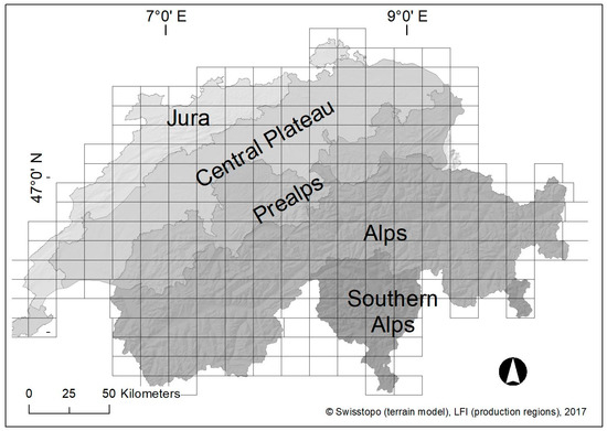 Switzerland is a central European country on the Alpine arc, located between 5°57′E and 10°29′E and 45°49′N and 47°48′N, and covers an area of 41,285 km2. The country has an altitudinal range between 197 and 4634 m a.s.l. and is characterized by five main types of landscapes: Jura, Central Plateau, Prealps, Alps and Southern Alps (Figure 2). According to Abegg et al. [25]. Switzerland has a varying regional proportion of forest cover with an average coverage of approx. 31%. Broadleaved trees make up 47.1% and coniferous trees 52.9% of the forest species composition. Species richness is higher in the Central Plateau than in the mountainous regions. Forests in the Central Plateau up to approx. 1200 m a.s.l. are managed to a high degree and are dominated by beech (Fagus sylvatica), ash (Fraxinus excelsior), oak (Quercus sp.), white fir (Abies alba), and spruce (Picea abies). The dominant tree species are Scots pine (Pinus sylvestris), larch (Larix decidua), and spruce (Picea abies), in addition to the typical broadleaved and softwood species growing along rivers and streams. The upper tree line varies between 1600 m a.s.l. in the northern Prealps to an average of 2300 m a.s.l. in the valleys of the Central Alps, and is often dominated by larch, Scots pine, and shrub forests with creeping pine (Pinus mugo) and green alder (Alnus viridis). More detailed information on Swiss forests is provided in the third NFI report [32].