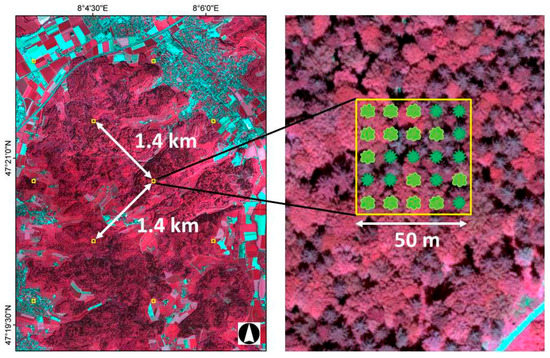 Swiss NFI data were used as an independent data set to validate the tree type map. The Swiss NFI is a continuous survey with plots surveyed over a period of nine years following a two-phase sampling approach that incorporates terrestrial surveys and aerial stereo-image interpretation. Stereo-image interpretation is conducted yearly over an area of 50 × 50 m around the plot center for one-ninth of the NFI sample plots on a 1.4 × 1.4 km grid covering the entire area of Switzerland using ADS stereo-imagery from 2006 to 2016. Each interpretation area (IA) consists of 25 equally spaced (10 m) lattice points (sub-sampling points) arranged in a 5 × 5 point design. See Figure 3 and Mathys et al. [35] for details. At each lattice point, the elevation is measured and 11 land cover classes are interpreted. From these classes, coniferous trees (including larch, a deciduous conifer) and broadleaved trees were used as a reference and their proportion was calculated per interpretation area. In sum, 4191 IAs that are entirely or partly located within the tree type map were surveyed.