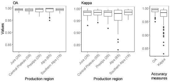 For the 220 subsets, the average model overall accuracy (OA) was 0.99 (ranging from 0.95 to 0.99) and Kappa averaged 0.98 (ranging from 0.83 to 0.99), with some variation in the NFI production regions. Figure 4 shows that the highest variation occurs for the NFI production region of the Alps. For 5% of the subsets, the overall accuracy was lower than 0.98, whereas it was higher than 0.99 for 50% of the subsets.