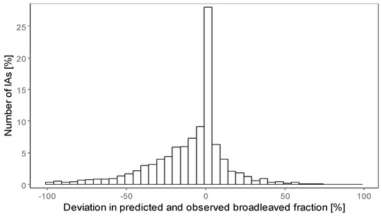 The distribution of the deviations between predicted and observed broadleaved fractions in the 3373 IAs is illustrated in Figure 6.