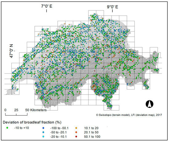 In Figure 7, the smallest deviations (±10%) in the fraction of broadleaved trees between the two data sets are depicted in green. These are regions in the Alps with a few outliers (red represents overestimation of broadleaved, and blue represents overestimation of conifers) in the valleys. The largest (negative) deviations in the broadleaved fraction indicate an overestimation of conifers (blue), which is concentrated in three regions: the east part of Switzerland, the central part and the Southern Alps.