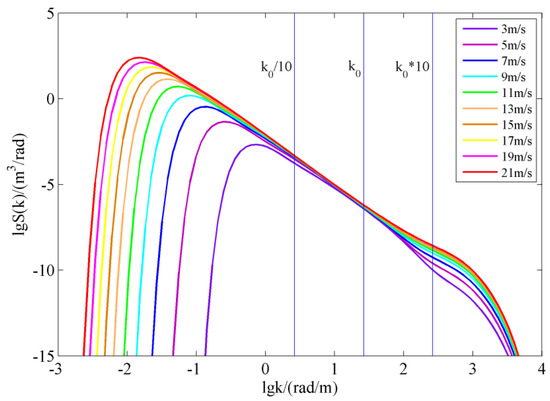 Apel omnidirectional spectrum in the full wavenumber range. The wind speed is from 3 to 21 m/s, with a 2 m/s interval. Here k0 = 26.39 rad/m is a microwave wavenumber corresponding to 1.26 GHz.