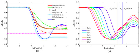In Equation (7), the last two items of the hyperbolic tangent function are basically the same as those of Elfouhaily’s Δ ratio formula. However, the constant am in the last item equals 0.26 by multiplying a factor of two by Elfouhaily’s am = 0.13.