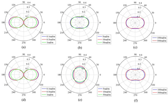 Numerical curves of two angular spreading functions in polar coordinates at 5 m/s wind speed, versus wavenumber k. The upper row represents Elfouhaily ASF, and the bottom row represents our ASF. (a) Elfouhaily ASF, 0.1, 0.5, and 1 rad/m wavenumber; (b) Elfouhaily ASF, 5, 10, and 50 rad/m wavenumber; (c) Elfouhaily ASF, 100 and 500 rad/m wavenumber; (d) Our ASF, 0.1, 0.5, and 1 rad/m wavenumber; (e) Our ASF, 5, 10, and 50 rad/m wavenumber; (f) Our ASF, 100 and 500 rad/m wavenumber.