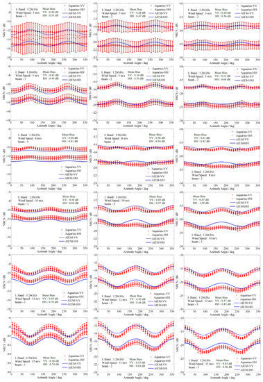 In Figure 7, our Δ radio and the Δ′ calculated by Aquarius observations are compared as a function of wind speed at three beams. As the figures show, the generally good agreements of Δ and Δ′ demonstrate that our semi-empirical model with a new ASF can simulate the NUC and PUC of ocean surface backscattering well. However, it should be noted that at 3 m/s and 15 m/s, Δ are less than Δ′, but the absolutes of Δ are larger and less than Δ′, respectively. This numerical feature explains the stronger and weaker directionality of our model simulations at 3 m/s and 15 m/s. Similarly, at beam 2 and 3, the larger absolute value of Δ at 8 m/s indicates the stronger directionality of our model results.