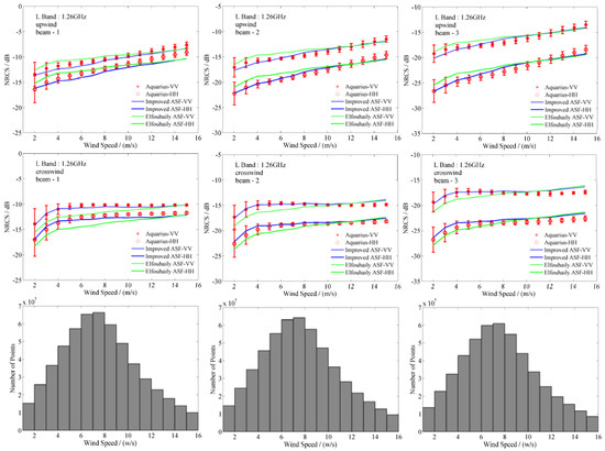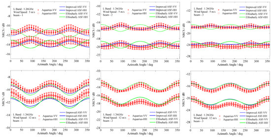 In Figure 6, the model NRCSs calculated with two different ASFs versus the wind speed were also compared to Aquarius observations in the upwind and crosswind direction. As the figures show, at all three beams, the model results using our improved ASF agree with the observations well, which indicate that our ASF has a better description of the directionality of the continuous gravity-capillary waves coupled with L-band microwaves. In addition, the model simulations with two ASFs show obvious gaps at low wind speeds, while they are close at high wind speeds. This also expresses the advantages of our ASF in the low wind speed range. It should be also noted that the L-band sea surface NRCSs keep increasing as the wind speeds increase in the upwind direction. However, the NRCSs in the crosswind direction increase only during the low wind speed range and remain almost steady at higher wind speeds. This suggests that the energy remains conserved for waves during the wavenumber range which are coupled with the incident microwave. A comparison with Aquarius observations shows that model simulations with our spectrum describe this feature well.