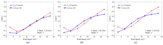 Comparison of Δ radio and Δ′ calculated by Aquarius observations versus wind speeds at L-band. Red dash lines with stars are Δ′ calculated in liner scale with Aquarius observations. Blue solid lines with open circles are Δ radios of our ASF. (a) Beam 1; (b) Beam 2; (c) Beam 3.