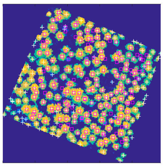 Result of individual tree detection (‘+’ in white: detected trees; □: field-measured trees).