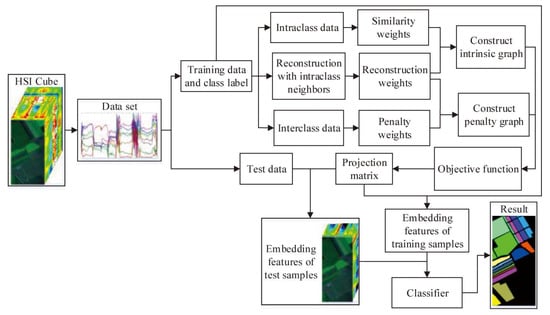 To effectively reveal the intrinsic manifold structure of hyperspectral data, a local geometric structure Fisher analysis (LGSFA) method was proposed based on MFA. This method computes the reconstruction point of each point with its intraclass neighbor points. Then, it uses the intraclass and interclass neighbor points to construct an intrinsic graph and a penalty graph, respectively. With the intrinsic graph, it utilizes the intraclass neighbor points and corresponding reconstruction points to compact the data points from the same class. With the penalty graph, it adopts the interclass neighbor points and corresponding reconstruction points to separate the data points from different classes. LGSFA further improves both the intraclass compactness and the interclass separability of hysperspectral data, and it can obtain better discriminating features to enhance the classification effect. The process of the LGSFA method is shown in Figure 1.