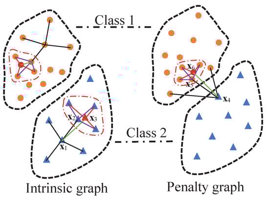 The graph embedding (GE) framework is used to unify most popular DR algorithms []. In GE, an intrinsic graph is constructed to describe some of the desirable statistical or geometrical properties of data, while a penalty graph is utilized to represent some of the unwanted characteristics of data []. The intrinsic graph and penalty graph are two undirected weighted graphs with the weight matrices and , where X denotes the vertex set. Weight reveals the similarity characteristic of the edges between vertices i and j in , while weight refers to the dissimilarity structure between vertices i and j in .