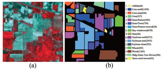 Indian Pines data set: This data set is a scene of the Northwest Indiana collected by the AVIRIS sensor in 1992. It consists of pixels and 220 spectral bands within the range of 375–2500 nm. Several spectral bands, including bands 104–108, 150–163 and 220, with noise and water absorption phenomena were removed from the data set, leaving a total of 200 radiance channels to be used in the experiments. Sixteen ground truth classes of interest are considered in the data set. The scene in false color and its corresponding ground truth are shown in Figure 5.