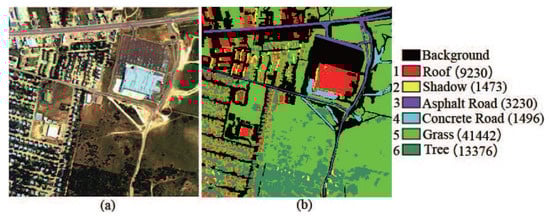 Urban data set: This data set was captured by the hyperspectral digital imagery collection experiment (HYDICE) sensor at the location of Copperas Cove, near Fort Hood, Texas, USA in October 1995. This data set is of size 307 × 307 pixels, and it is composed of 210 spectral channels with spectral resolution of 10 nm in the range from 400 to 2500 nm. After removing water absorption and low SNR bands, 162 bands were used for experiment. Six land cover types are considered in this data set. The scene in false color and its corresponding ground truth are shown in Figure 6.
