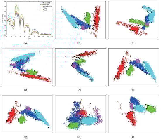 Two-dimension embedding of different DR methods on the Indian Pines data set. (a) Spectral signatures; (b) PCA; (c) NPE; (d) LPP; (e) SDE; (f) LFDA; (g) MMC; (h) MFA; (i) LGSFA.