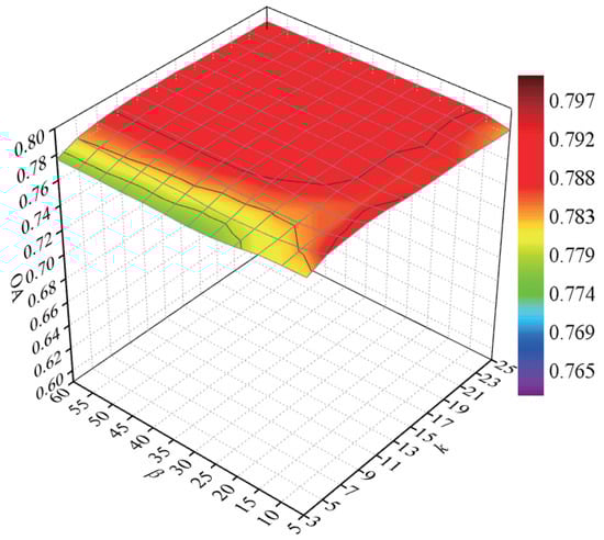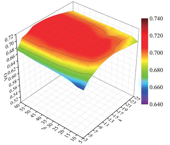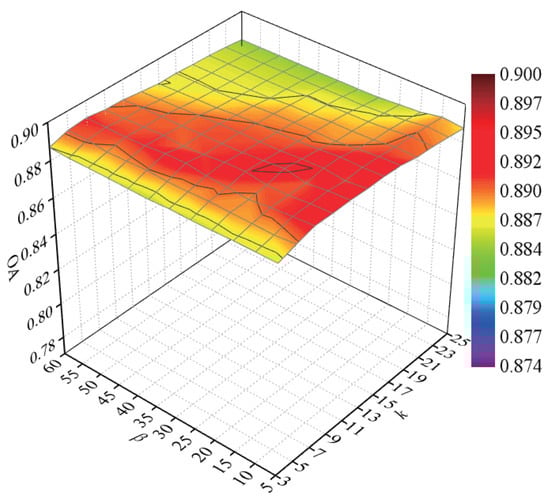 To explore the influence of parameters k and , 60 samples were randomly selected from each class for training, and the remaining samples were used for testing. The NN classifier was adopted to classify the test samples. Figure 11 shows the OAs with respect to parameters k and .