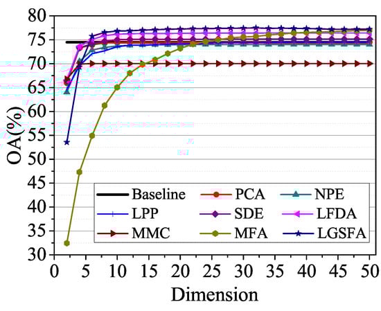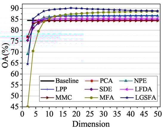 According to Figure 9, the classification accuracies improved with the increase of the embedding dimension and then reached a peak value. When the embedding dimension exceeded a certain value, the classification results of LGSFA began to decline, which resulted in the Hughes phenomena. NPE, LPP, LFDA, MFA, and LGSFA achieved better results than the baseline, thus indicating that the DR methods can reduce redundant information in HSI data. MFA and LGSFA generated higher OAs than other DR methods, the reason is that MFA and LGSFA can effectively reveal the intrinsic properties of hyperspectral data. In all the methods, LGSFA obtained the best classification accuracy, which indicates that LGSFA can better represent the intrinsic manifold of hyperspectral data that contains many homogenous areas.