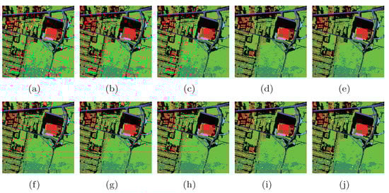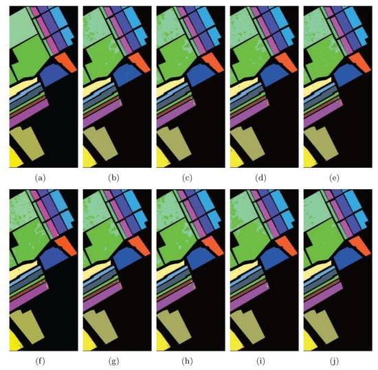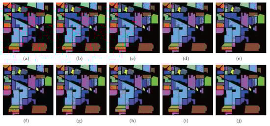 To show the classification results of each class, we randomly selected 2% samples as training set, and the other samples were used for testing. The classification maps are shown in Figure 16.