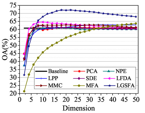 To explore the relationship between the classification accuracy and the embedding dimension, we randomly selected 60 samples form each class for training, and the remaining samples were used for testing. Figure 15 shows the OAs with different dimensions using the NN classifier. As shown in Figure 15, the OAs improved with the increase of the embedding dimension and then kept a balanced value. Compared with other methods, the proposed LGSFA method provided the best classification results.