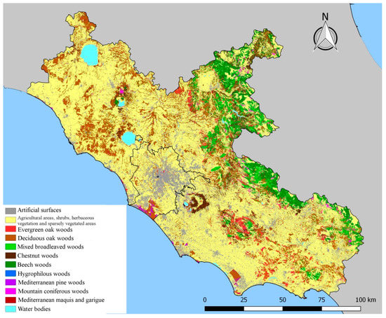 This study was carried out in the Latium Region, focusing on the Municipality of Rome. Latium is located on the western side of Central Italy (41°53′35″N 12°28′58″E) and covers 17,232 km2, with roughly six million inhabitants. The region presents different climatic regimes depending on the distance from the Tyrrhenian Sea, and has complex morphology and lithology. Climatic conditions vary from temperate with large amounts of precipitation in the inner mountains areas to typically Mediterranean along the coastal areas [40]. Owing to the environmental heterogeneity and biogeographic complexity, the Latium Region features highly diverse tree species that are often located within national and regional parks [41], as well as numerous natural reserves [42].