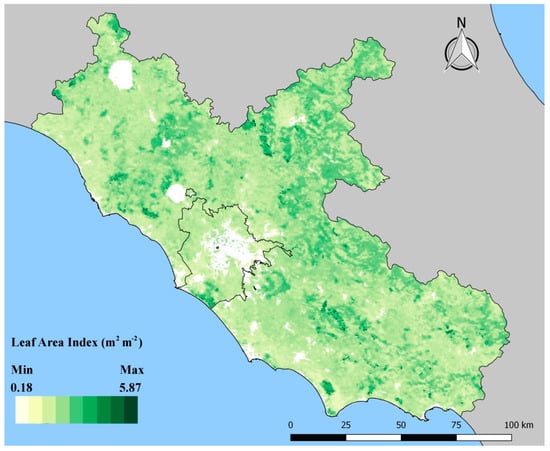 The distribution of LAI values (Figure 2) presents maximum values up to 5.87 m2·m−2, with the higher values predominantly corresponding to forested areas. In particular, higher LAI values are observable for evergreen species. Inside the municipality of Rome, higher values are noticeable inside the Castelporziano Presidential Estate (from about 3–5 m2·m−2), whereas other areas show values around 0.5–2.5 m2·m−2. Outside the municipality boundaries, higher values are evident for most natural forested areas of the Latium Region, such as the Simbruini regional park in the north and the Alban hills in the southeast, as well as rural areas around lakes in the northwest, such as the Tolfa beech woods.