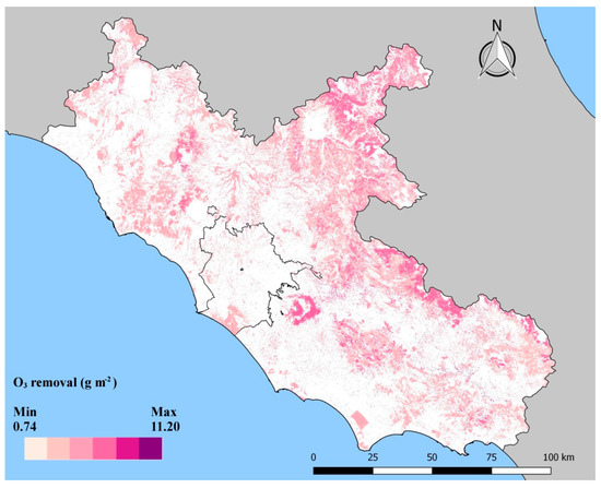 The map of O3 removal (Figure 4) shows variations in absorption values from 0.7 to 11.2 g·m−2. Low values are present inside the municipality of Rome and in the coastal sector, although O3 mean concentrations are higher in this area (see Supplementary Materials, 1-B). The southeastern part of the region also displays low removal values, where evergreen oak forests are present. The highest rates are noticeable in the northeastern areas of the Latium region, characterized by the presence of vast deciduous forest stands as beech woods and chestnut woods. Regarding the annual O3 removal values (Table 4), it is noticeable that deciduous species present the highest removal rate. Inside the Municipality of Rome, chestnut woods remove 0.0601 Mg per hectare, while deciduous oak woods remove 0.0337 Mg per hectare. Elevated values are present for Mediterranean maquis, (0.0365 Mg∙ha−1), while the lowest values were estimated for mountain coniferous woods (0.0190 Mg∙ha−1), and Mediterranean pine woods (0.0197 Mg∙ha−1). Similarly, in the surrounding Latium region, elevated values are present for deciduous species. In particular the highest value is shown by hygrophilous woods, with 0.0977 Mg removed per hectare, followed by chestnut woods (0.05992 Mg∙ha−1), and beech woods (0.0570 Mg∙ha−1). Mediterranean maquis also presents elevated removal rates (0.0375 Mg∙ha−1), along with deciduous oak woods (0.0336 Mg ha−1). Lower rates are evident for Mediterranean pine woods (0.0201 Mg∙ha−1), and evergreen oak woods (0.0240 Mg∙ha−1). The monetary valuation showed an overall value of around 149 million Euro (3.783 million Euro estimated for the Municipality of Rome and 145.024 million Euro outside the Municipality).