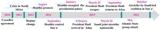 - Yemen Profile—Timeline. Available online: http://www.bbc.com/news/world-middle-east-14704951 (accessed on 19 June 2017).