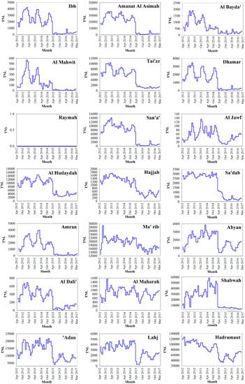 - At the national scale, nighttime light showed a sharp decline from February 2015 to June 2015, and TNL lost 71.60%. The nighttime light in all provinces also showed the decline period. These findings reflect that the Saudi-led airstrikes caused widespread and severe humanitarian crisis in Yemen.