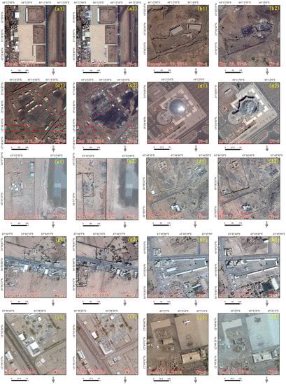 - Marx, A.J. Detecting urban destruction in Syria: A landsat-based approach. Remote Sens. Appl. Soc. Environ. 2016, 4, 30–36. [Google Scholar] [CrossRef]