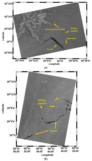 - Minchew, B.; Jones, C.E.; Holt, B. Polarimetric analysis of backscatter from the deepwater horizon oil spill using l-band synthetic aperture radar. IEEE Trans. Geosci. Remote Sens. 2012, 50, 3812–3830. [Google Scholar] [CrossRef]