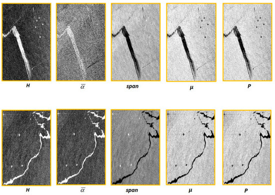 Table 1 is a sectional table extracted from Reference [26], summarizing the behaviors of fully Pol-SAR features of seawater, lookalike and oil spill. According to the table, it can be known the pixel values of and of oil spills are high, so their image tone should be brighter than the area covered by water or lookalike. On the contrary, the values of , , and M33 of oil spill are low, therefore their image tone should be darker than the area covered by water or lookalike. According to this criterion [26], in terms of behavior of fully Pol-SAR features of an oil spill and water/lookalike, we can determine that the long strip objects in Dataset 1 and Dataset 2 in Figure 2, are oil spills, rather than lookalikes.