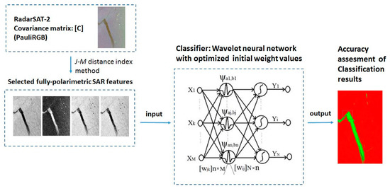 Figure 3 demonstrates the scheme of the proposed method. The method includes two main parts. The first main part is about the selection process of the fully Pol-SAR features based on the J-M distance index method, extracted from RadarSAT-2 SAR data. The selected features will be used as the inputs of an optimized classifier. The process is explained in detail in Section 2.2.2. The second key part of the proposed method is an introduction about developed optimized wavelet neural networks (WNN) classifier. The optimization processing of the classifier is exhibited in Section 2.2.3. Oil spill classification results will be generated based on the optimized WNN classifier with the multiple selected fully Pol-SAR features. Classification accuracy will be assessed and compared with these based on: (1) un-optimized WNN classifier; and (2) single fully Pol-SAR feature. The effectiveness of the proposed method will be estimated in Section 4.