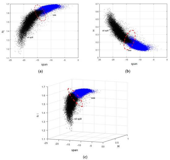 Clusters of ocean oil spill and water in region of interesting in two and three dimensional feature space: (a) span-; (b) span-H; and (c) -span-H.