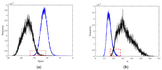 Probability density of ocean oil spill and water in region of interesting in one dimensional feature space: (a) span; and (b) H.