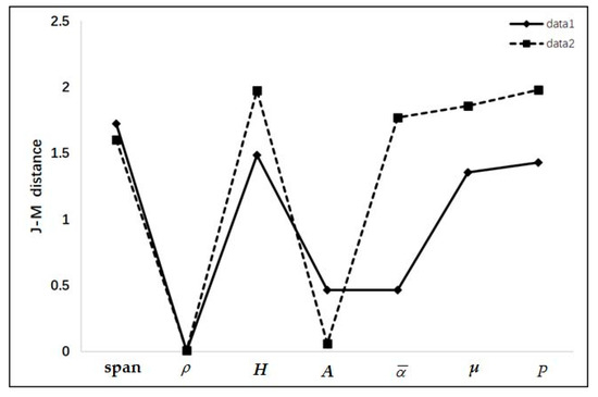 where J represents J-M distance index under a certain feature, such as span or in this study. m1 and m2 are mean of a certain feature value of two kinds of different ground objects, respectively. In this study, m1 and m2 are mean of the feature value of oil spill and water. and are the deviation of a certain feature value of oil spill and water, respectively. The value range of J is 0–2. When the value of the J is 0–1, the two objects have weak separability under a certain feature. When J is 1–1.9, the two objects have a certain separability under a certain feature. When J > 1.9, the two objects have strong separability under a certain feature [44].