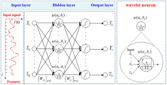 The WNN applied in this study includes an input layer, a hidden layer, and an output layer. A corresponding weight value matrix is used for connecting the input layer with the hidden layer, and the hidden layer with the output layer. The WNN architecture with a single hidden layer is shown in Figure 8.