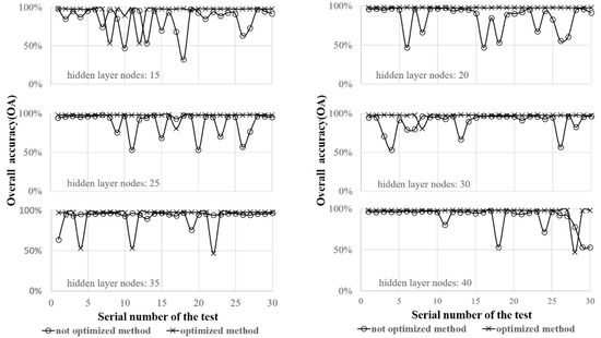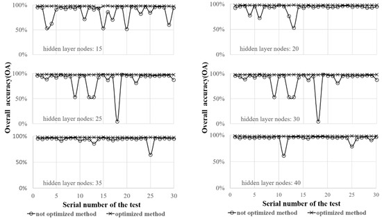 Figure 10 and Figure 11 demonstrate the classification results of Image 1. Figure 10 shows the mean of overall accuracy (OA) and kappa coefficient of 30 times of tests of Dataset 1 with the optimized WNN and un-optimized methods. The optimal WNN is obviously superior to the un-optimized WNN. No matter how many hidden layer nodes of the WNN, the optimized method has higher average classification accuracy. Meanwhile, the un-optimized WNN presents obvious fluctuation in classification accuracy. Especially when the number of the hidden layer nodes is 15, 20, 25, and 30, the OA of classification shows strong fluctuation. When investigating the convergence of these two classifiers, we can see that 30 times of classification tests of the optimized classifier are all convergent. However, the un-optimized WNN did not converge twice when hidden layer node is 25 and 30. The experimental results of Dataset 1 show that the optimized classifier has better and stable classification ability.