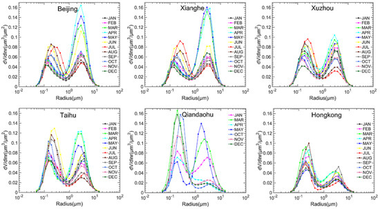 Monthly mean value of volume size distribution in AERONET sites of Beijing, Xianghe, Xuzhou, Taihu, Qiandaohu, and Hongkong, respectively.