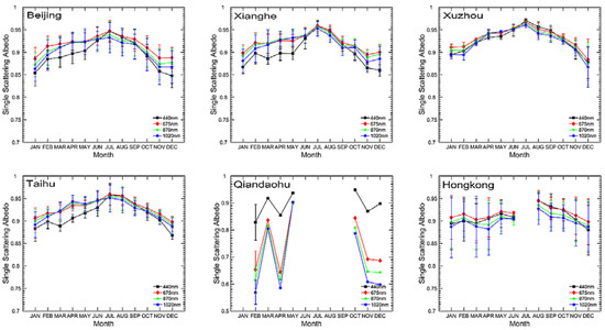 Aerosol SSA exhibits large temporal variations in eastern China (Figure 3). The SSA values at 440 nm in northern China range from ~0.85 in the winter season (that uses coal-burning for heating) to ~0.95 in humid summer. The SSA increases gradually from January, reaches its maximum value in July, and then begins to decrease. In southern China (Qiandaohu and Hongkong), where no coal-burning is needed for heating in winter, the temporal change of the SSA is smaller (~0.90–0.95), but there is also an obvious increase in the SSA during summer associated with enhanced hygroscopic growth in humid conditions. It is worth noting that the SSA in Qiandaohu may be not typical due to only few available inversion data from AERONET in most months. Overall, for most sites, the variations of the SSA show a larger dependence on wavelength in winter and spring but a smaller dependence in summer and fall, which can caused by a mixture of anthropogenic aerosols and coarse dust in winter and spring [31]. Large daily variations in the SSA also exist in Beijing and Hongkong, where regional transport usually superposes on local pollution.