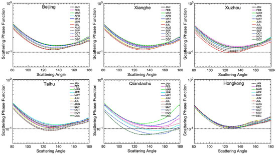 Corresponding to the temporal variation of size distribution and SSA, and relevant to the satellite retrieval algorithm that uses backscattered solar radiation, Figure 4 shows the variation of phase function at backward direction over different AEROENT sites. In northern China, the monthly phase function exhibits approximately 20–30% of its variation at around 90–150° in the back-scattering directions. It can be seen that the phase function is lowest in summer (red lines) with fine particles dominant and highest in spring (blue lines) with prevalent dust, reflecting the change of particle size. Indeed, the composite phase function for fine-mode and coarse-mode aerosols in an atmospheric column depends not only on the size distributions for both modes, but also on the scattering optical depth of both modes and the relative weighting. Fine-mode particles have a relatively larger size (due to efficient hygroscopic growth, Figure 2) in summer than in winter, and hence a relatively smaller phase function in the backscattering direction. This size effect, together with more efficient scattering (again due to hygroscopic growth) and a more dominant contribution of fine mode aerosol to the total aerosol optical depth, makes the columnar phase function as whole smaller in summer. Indeed, with a reduction in the fraction of coarse mode particles, the phase function in summer gets lower than 0.1 at Xuzhou and other sites in the south to Xuzhou. Notably, the phase function is much lower at the Qiandaohu site in most scattering angles during October and December, when fine particles are absolutely dominant with very low volume in coarse mode (Figure 2). However, temporal variations of the phase function in Hongkong are much smaller, which is consistent with the particle size distribution. Thus, it is important to make a proper assumption of particle size in aerosol models for satellite retrievals.
