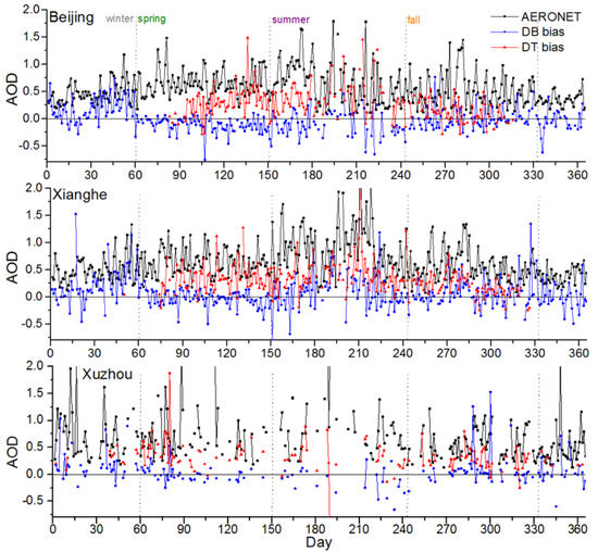 Figure 5 shows the daily variations of MODIS DB and DT AOD biases compared with AERONET AOD in northern China (Bejing, Xianghe, and Xuzhou). To reduce the influence from uncertainties of surface reflectance estimation, the bias of satellite retrievals was considered to be robust and analyzed only when the AERONET AOD550 is >0.4. With only a few exceptions, MODIS DB retrieval of the AOD overall has a distinct positive bias in winter (in the range of 0.13–0.24) and slight overestimation in fall, but small negative bias in other seasons (except in Xianghe, Table 2). In particular, a clear switch between positive and negative bias can be found at all of the three sites (Bejing, Xianghe, and Xuzhou) with the same time nodes. In contrast, the AOD in MODIS DT retrievals exhibit obvious overestimation during the whole year, with few values in winter due mostly to the bright surface that is not suitable for retrieval from the DT algorithm (red line Figure 5). Considering that the aforementioned biases are systematic and periodic, it is likely that the difference between the actual and assumed aerosol properties by season can play a dominant role.
