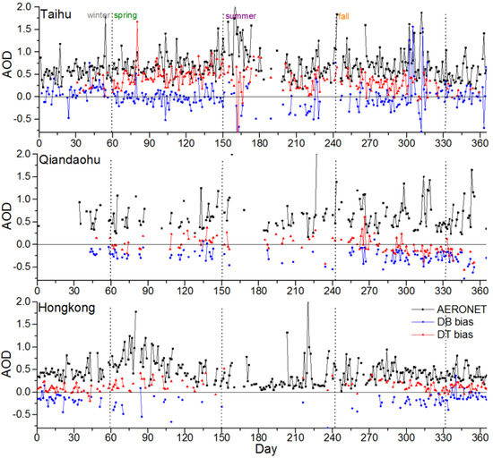 Daily mean values of AERONET AOD (black curve) and bias of MODIS DB and DT AOD (red and blue curves, respectively) when AERONET AOD550 > 0.4 in Taihu, Qiandaohu, and Hongkong.