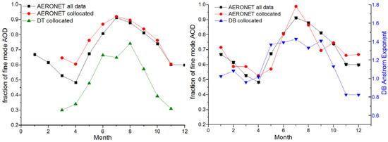 (Left) Comparison of AERONET fine AOD fraction at 500 nm (black), collocated AERONET (red) and MODIS DT fine mode aerosol fraction at 550 nm (green), (right) and DB Ångström exponent at 412 and 470 nm (blue) in Beijing.