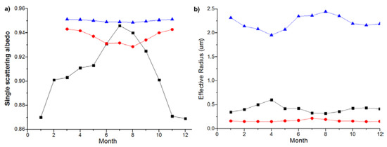 (a) Comparison of monthly mean SSA (black) and MODIS DT SSA from fine (blue for non-absorbing and red for moderately absorbing) and coarse aerosol models at 0.55 μm; (b) Monthly mean AERONET effective radius (μm) for total column (black), fine mode (red), and coarse mode aerosols (blue) in Beijing.